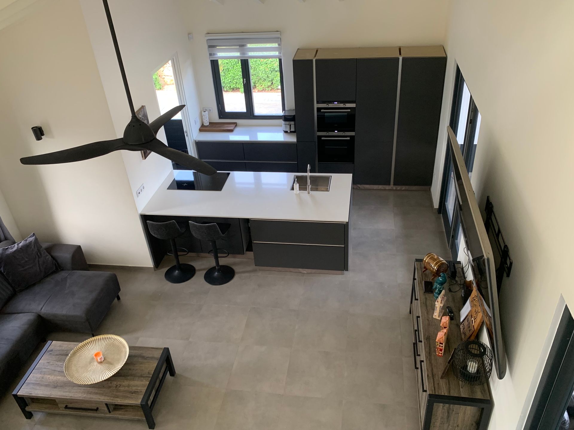 The house and the apartment are designed with social gatherings in mind, boasting two living rooms, two dining rooms, and two open kitchens. The floors, covered with ceramic tiles, offer both elegance and durability. Wooden glass doors and wooden windows contribute to the warm atmosphere of the villa.