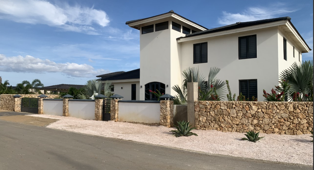 The grounds are tastefully landscaped, surrounded by gravel, and the boundaries are characterized by beautiful coral stone walls with wrought iron entrance gates. The house, strategically placed on the property, is designed to make optimal use of the refreshing breeze.