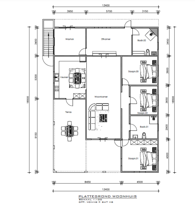 Main House: 3 bedrooms, 1.5 bathrooms, large terrace, spacious kitchen, living, and dining area.
